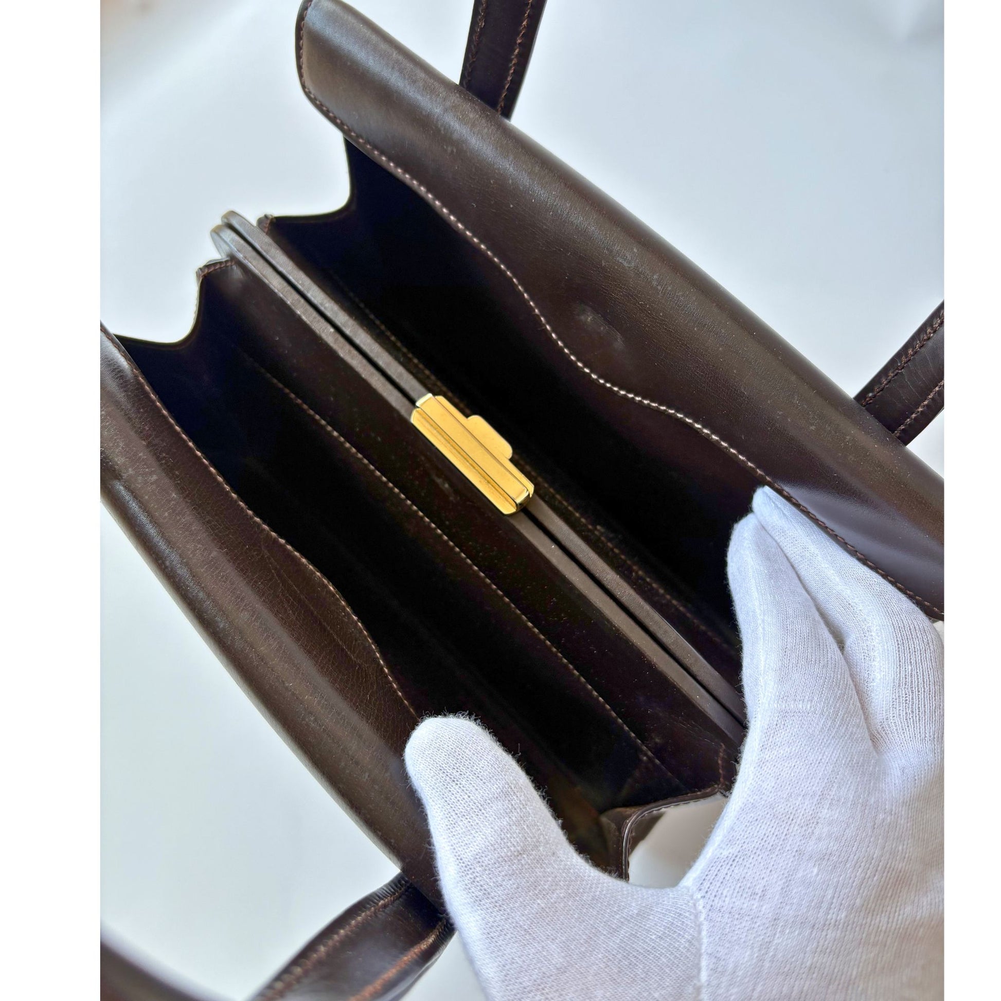 Vintage Gucci handbag in smooth black leather, an iconic structured model from the 70s and 80s. With its sleek silhouette, clean lines and gold details (decorative buckles and metallic finishes), this bag embodies the chic, understated style of Gucci's golden age.