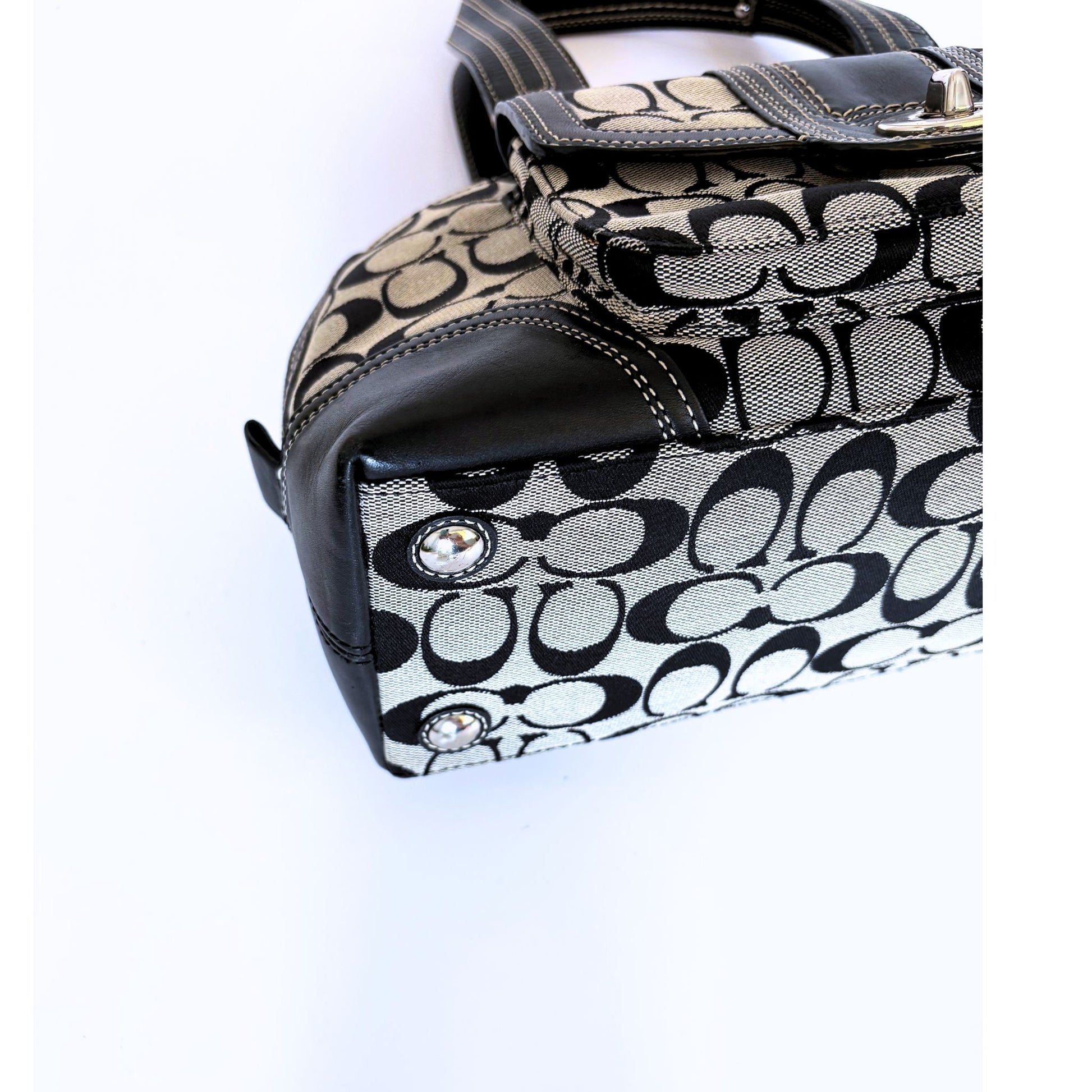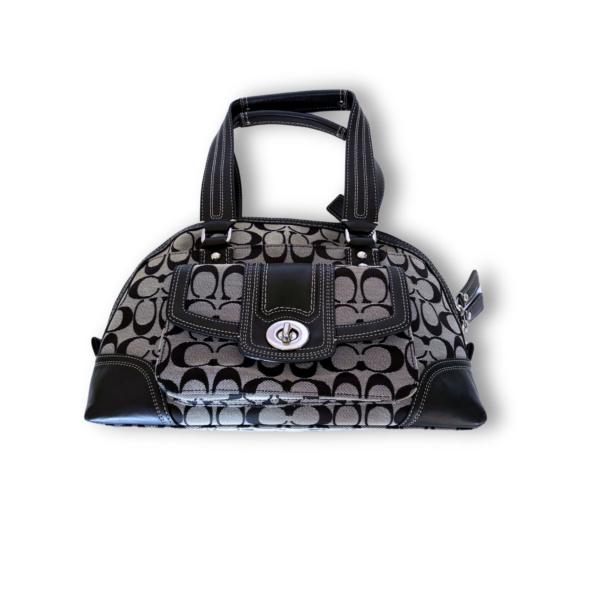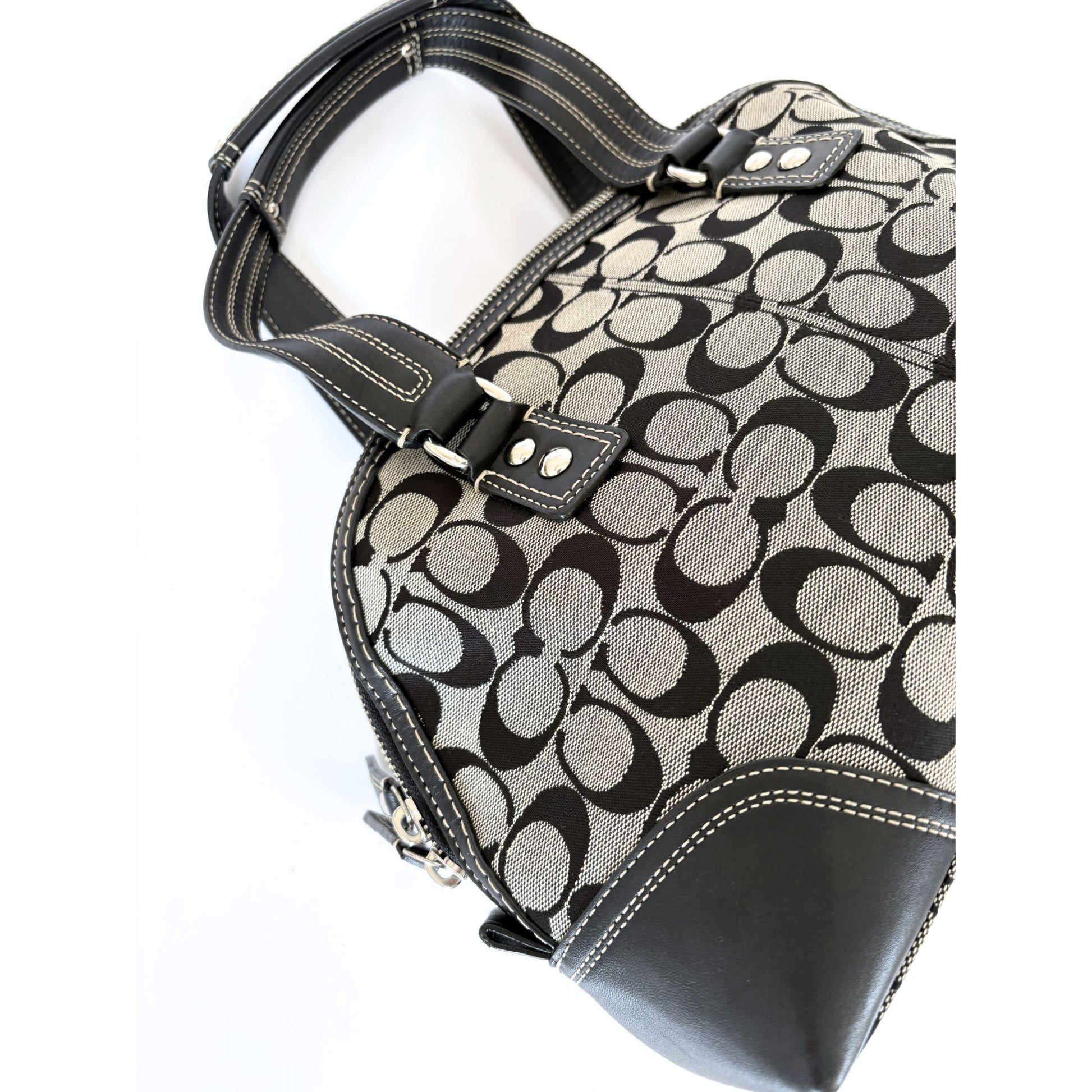 Inspiré des sacs de bowling classiques, ce Coach Dome Bowler vintage mêle parfaitement élégance rétro et fonctionnalité moderne. Confectionné en toile signature Coach monogrammée et rehaussé de détails en cuir noir, ce modèle emblématique séduit par sa silhouette arrondie et sa structure souple mais spacieuse.